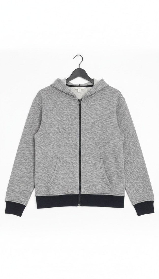 Erkekler için gri hırka, tam ön fermuarlı, uzun kollu ve rahat kesimdir. Yumuşak ve sıcak kumaştan üretilmiş, ön cepler ve ribanalı manşetlere sahiptir.