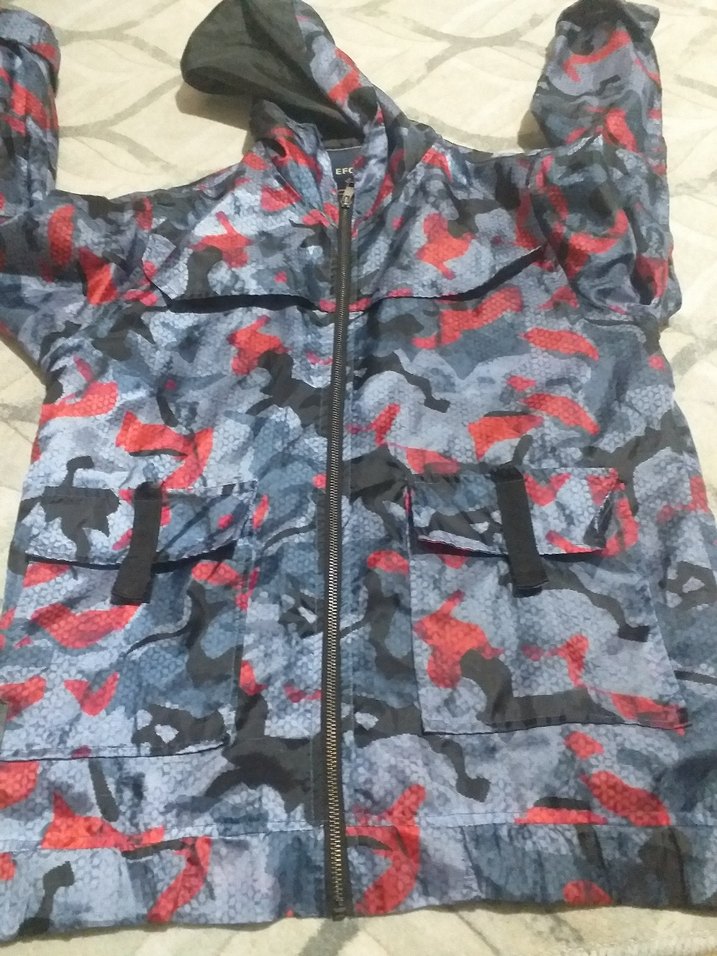 Bu erkek çocuk ceketi, koyu gri kamuflaj desenli ve kapüşonludur. Fermuarlı, bol kesim ve sentetik kumaştan üretilmiştir, günlük sokak tarzı için uygundur.