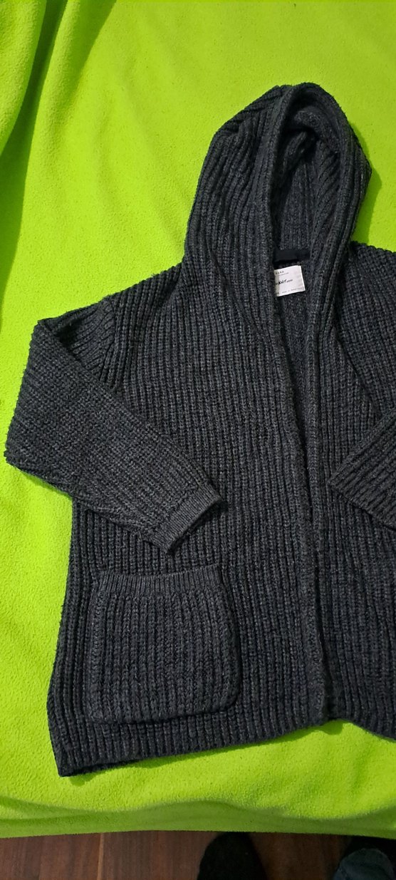 Erkek çocuk için gri renkli, kapüşonlu, uzun kollu, bol kesim örme triko hırka. Önünde iki cep bulunur, desensiz ve rahat bir tasarıma sahiptir. temiz urun kalin özelliği fermuar ilik dugme yok