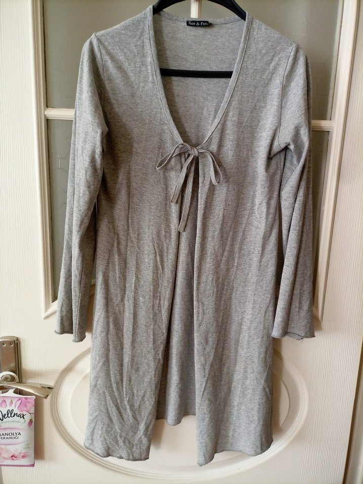 Gri renkte, uzun kollu, V yaka ve midi boyda, bol kesim Hırka. Desensiz ve rahat bir kullanım sunar.