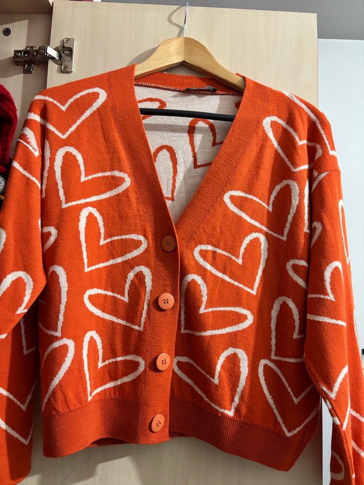 Renkli turuncu kalp desenli, düğmeli, uzun kollu, V yakalı, bol kesim hırka. Günlük sokak stili için uygundur. ❤️