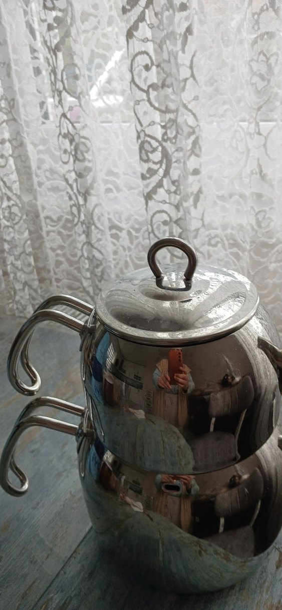 Parlak metal görünümlü gri çaydanlık seti, yuvarlak kapak kulpu ve kavisli ağızlığı ile çay demlemeye uygundur.