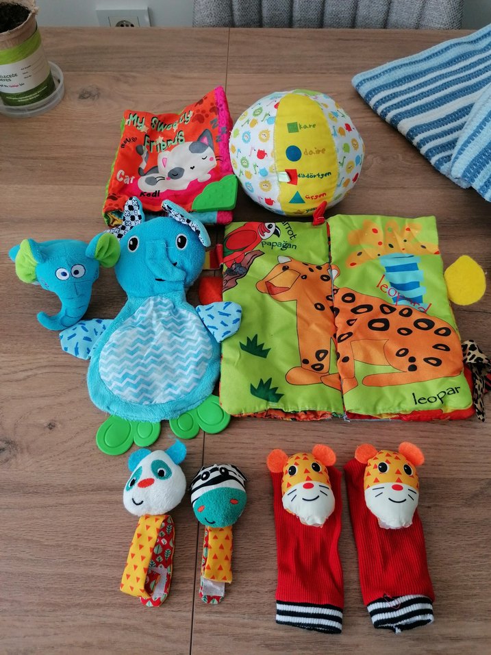 Çeşitli hayvan figürlü, yumuşak dokulu renkli çıngırak seti ve hışırtılı kitaplar