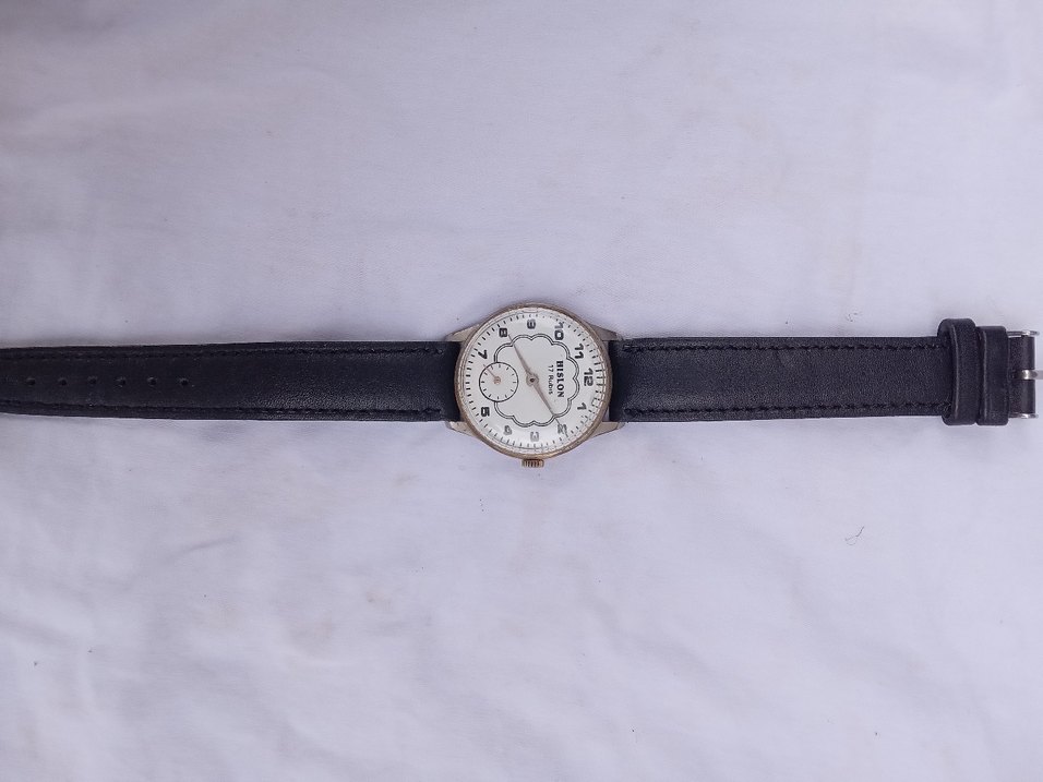 Hislon 17 rubis çalışmasında sorun yoktur.Beyaz kadran, gri kasa ve siyah deri kayışa sahip vintage erkek kol saati. Klasik rakam göstergeleri ve küçük saniye alt kadranı bulunur. ⌚