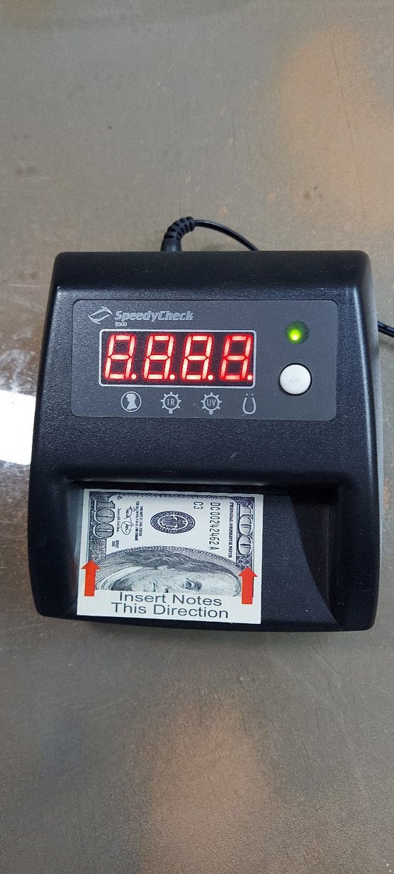 Bu siyah SpeedyCheck tarayıcı dijital ekran ve notların yönünü gösterir. Optik karakter tanıma ile not doğrulama sağlar. ️