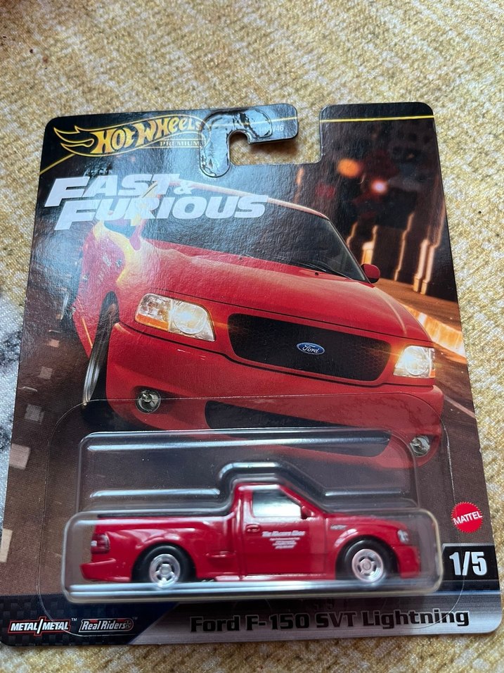 Fast & Furious serisinden kırmızı Ford F-150 SVT Lightning modeli, detaylı tasarıma sahip Hot Wheels oyuncak araba.