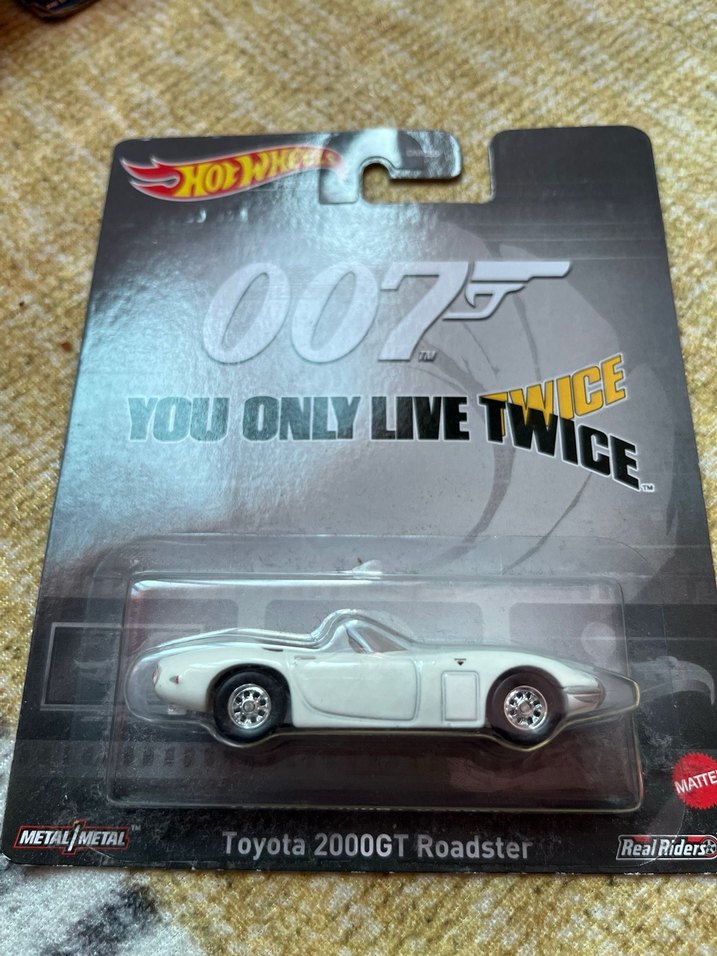 Parlak beyaz Hot Wheels Toyota 2000GT Roadster metal gövdeli ve gerçek sürücü tekerlekli oyuncak araba, 007 You Only Live Twice serisine ait.