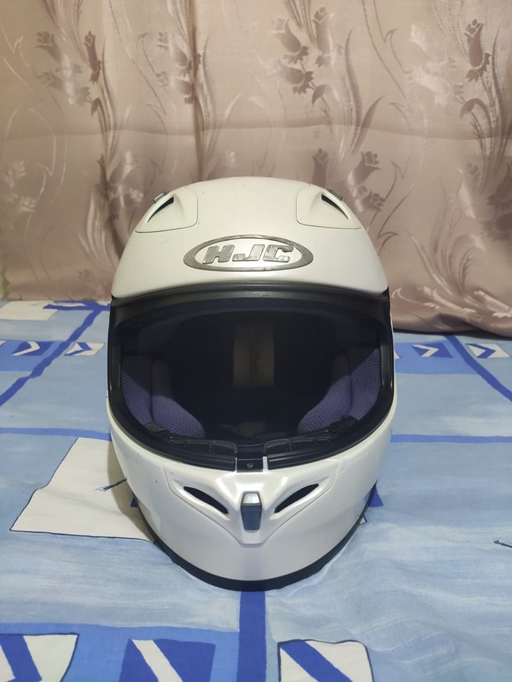 Beyaz seramik motosiklet kaskı, minimalist ve desensiz tasarıma sahip. Velcro kayış ile güvenli oturuş ve şeffaf vizör bulunur. ️
