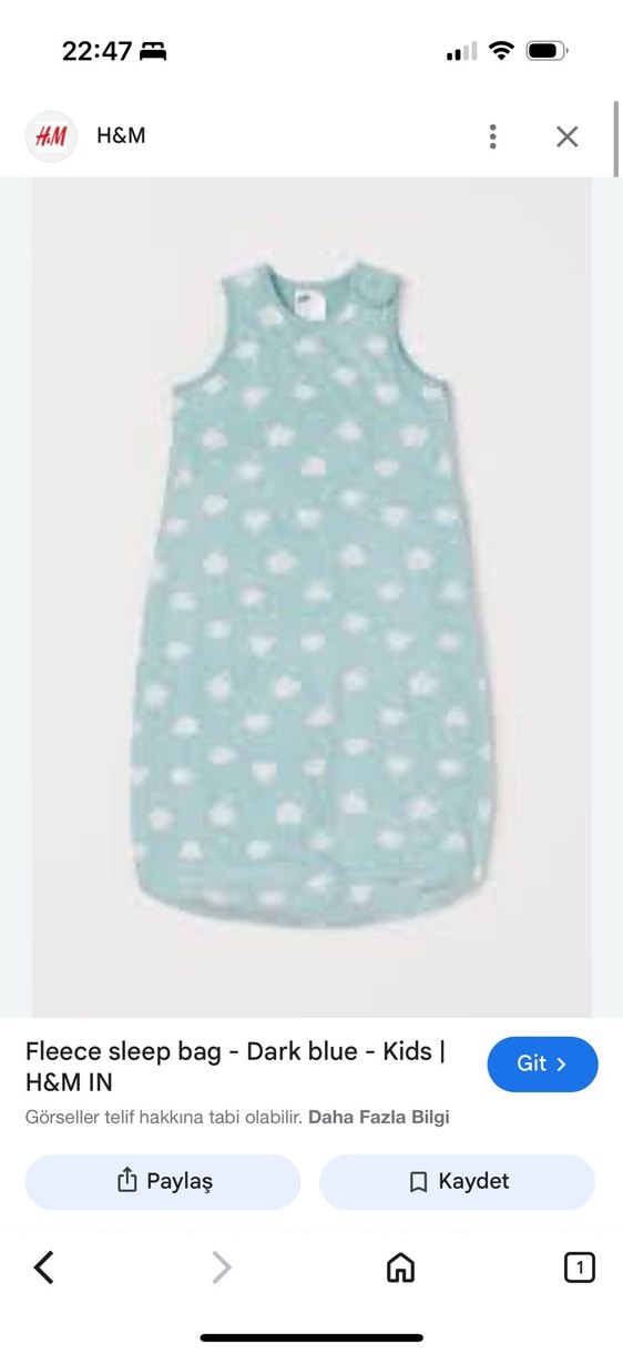 Çocuklar için yumuşak ve sıcak polar kumaştan yapılmış, pastel turkuaz renkli, desenli uyku tulumu. HM ürünüdür hiç bir deformesi lekesi yoktur. Geceleri üstü açıldı mı , yorgan yüzünü örttü mü derdi olmadan rahat konforlu uyku sunar . 2,5 tog