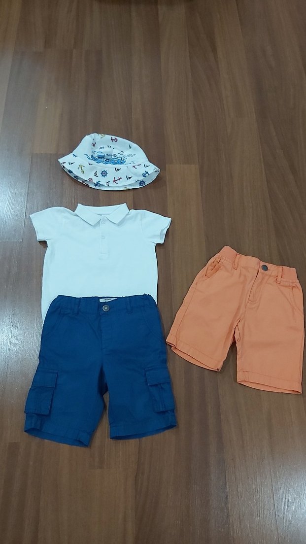 Pamuklu beyaz kısa kollu polo gömlek ve mavi ile turuncu renkli iki şorttan oluşan erkek bebek takımı. Rahat ve şık günlük kullanım için. Beyaz baskılı şapka dahil. hepsi tertemiz hiçbir kusuru yoktur şortlar ve şapka sıfırdır