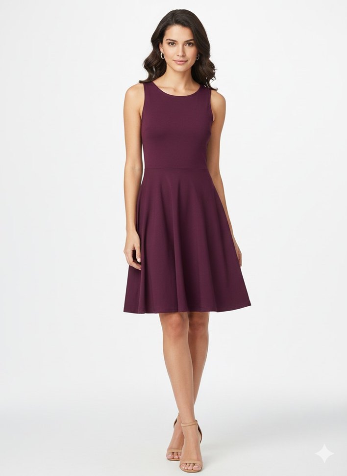 Bordo renkli, kolsuz, midi boy ve fitted kesime sahip bu elbise, rahat ve şık bir görünüm sunar. Romantik akşamlar için uygundur.