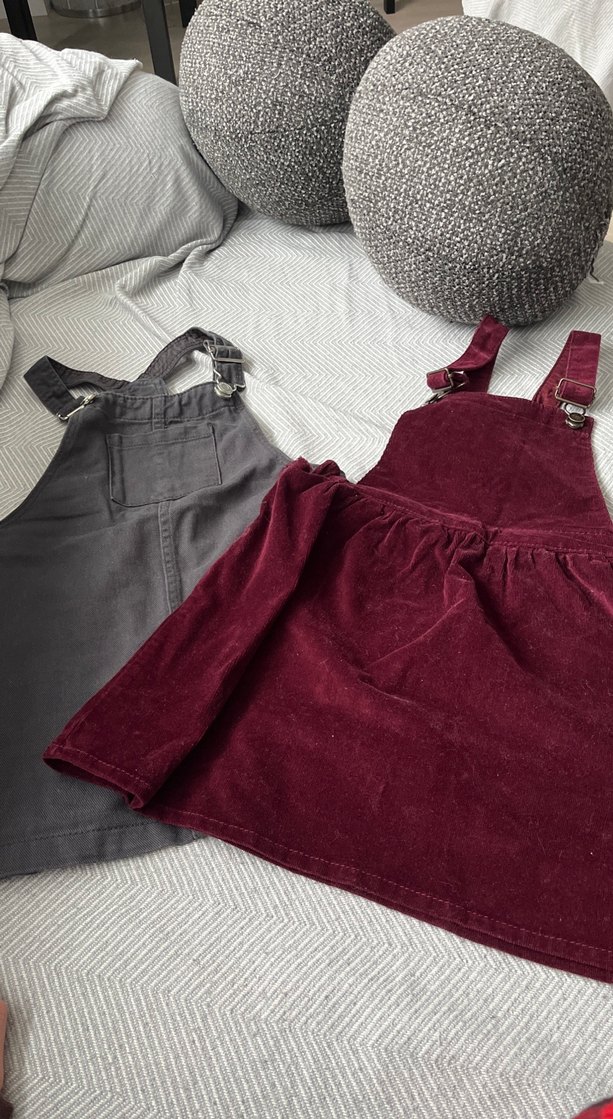 Kız çocukları için bordo ve gri renklerde, askılı ve tokalı salopetler. Rahat ve salaş kesime sahip, desensiz kumaş kullanılmış.