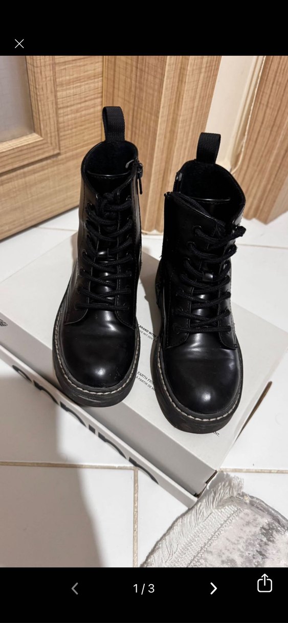 Siyah kauçuk malzemeden platform topuklu, bağcıklı ve tokalı çocuk bot Trendy ve günlük kullanıma uygun.sağlam tertemiz giyilmedi zaten yeni gibi