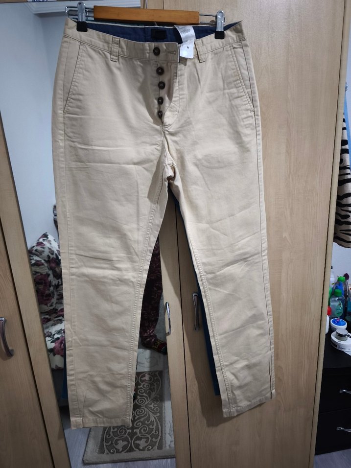 Düğmeli ön cep detaylı, bej renkli pamuklu regular fit erkek pantolon. Günlük kullanım için uygun, midi boy ve desensiz tasarıma sahip. pantolonların ikisini 200e veriyorum