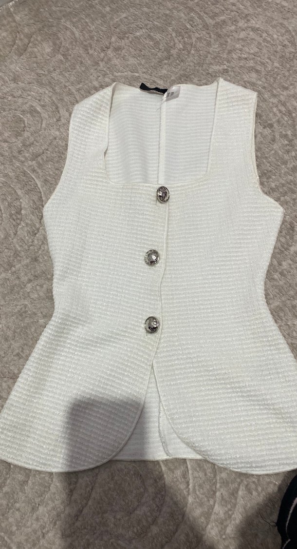 Kolsuz, düğmeli beyaz yelek, keskin yakaya ve midi boyuta sahip. Yumuşak sentetik kumaştan, günlük sokak modasına uygun şık tasarım.