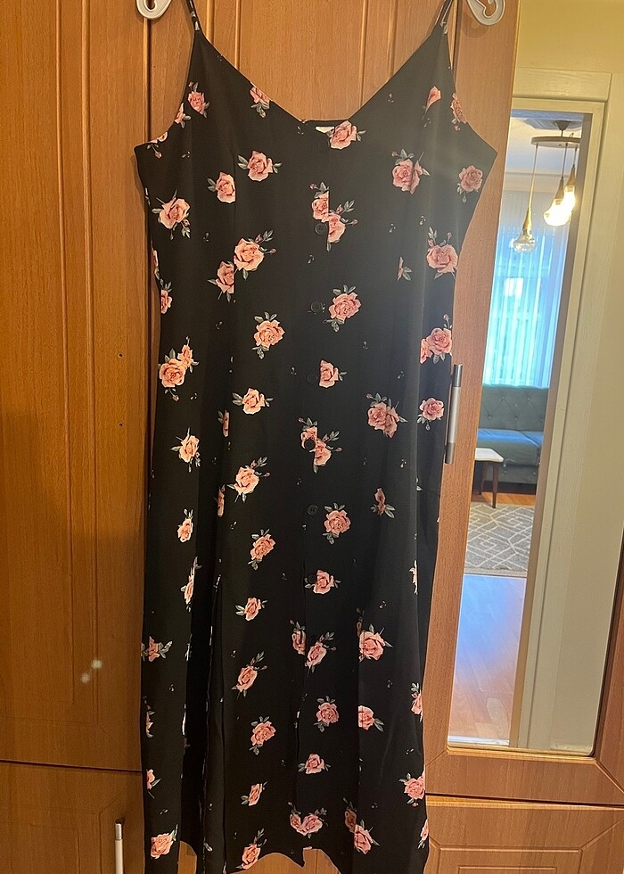 hiç giyilmedi . 44 beden fakat 40-44 beden uyumlu yazlık rahat bir elbise Defosu yok temiz . Etek kısımlarında minik yırtmaçları bulunmakta