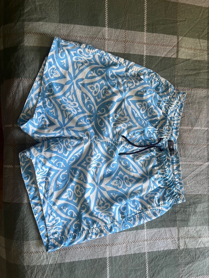 Gecen sene aldim. Bi yaz ikinci yedek mayo olarak giydim. Temiz urun. Mavi tie-dye desenli, lastikli bel ve bağcıklı erkek şort mayo.