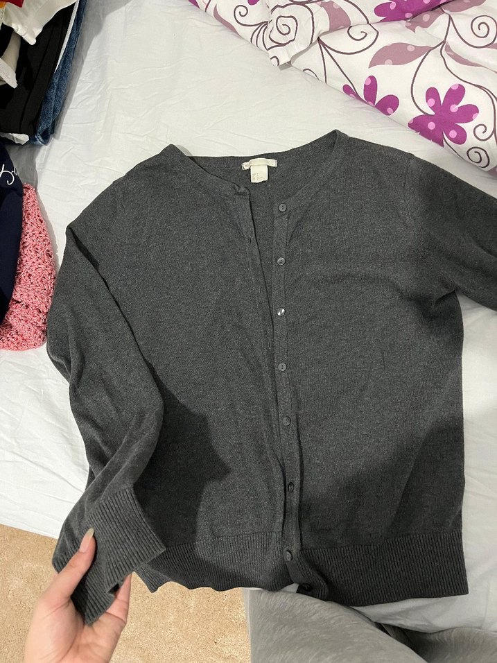 Gri renkli, düğmeli, uzun kollu, pamuk malzemeden yapılmış, rahat kesimli kadın hırka. Günlük kullanıma uygun, normcore tarzda, konforlu bir parça.