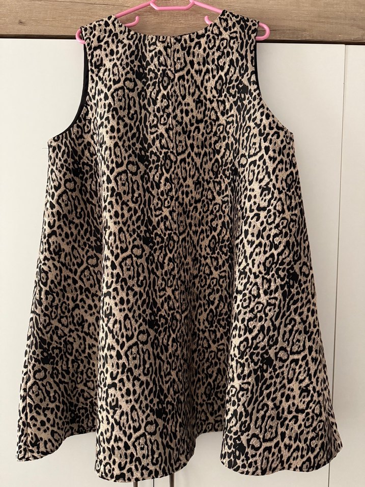 Koyu kahverengi leopar desenli, kolsuz çan elbise ve bol kesim, jakarli kumaştandir. İki kere bir kaç saatliğine giyildi. Yeniden farki yoktur.