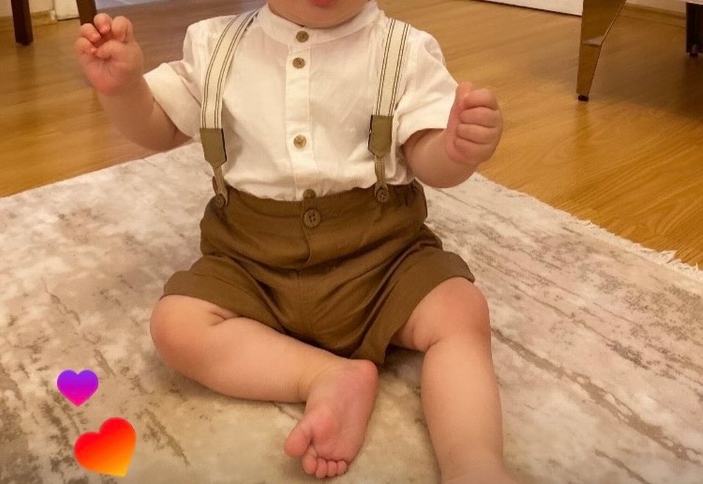 Pamuklu beyaz gömlek, düğmeli ve kesimli yakaya sahip, kahverengi şortlar ise askılı klasik tarzda bebek takımı.