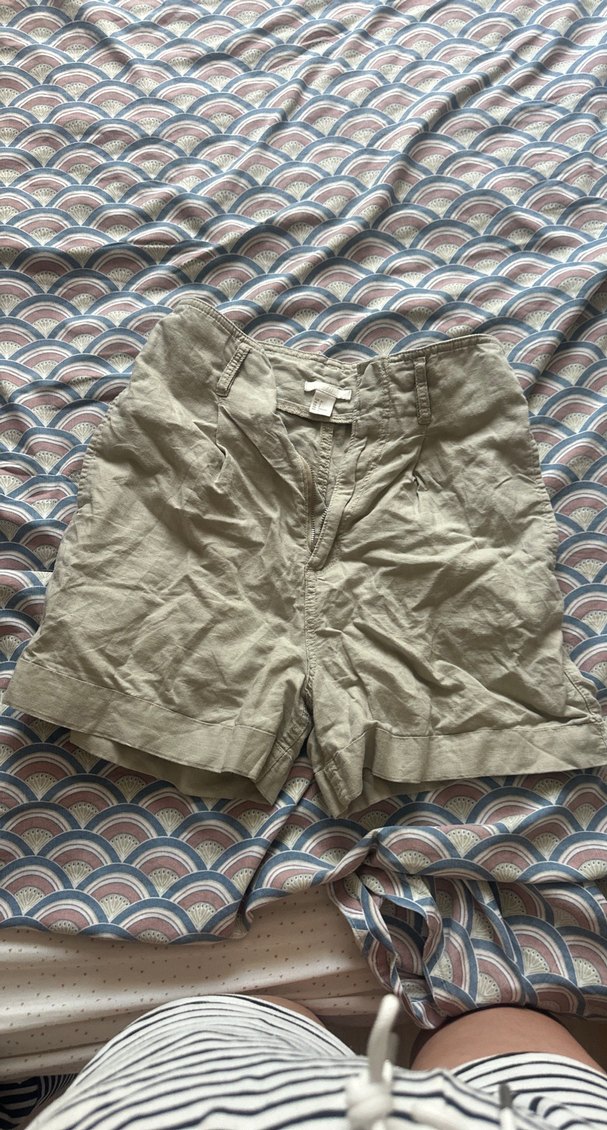 Yumuşak keten kumaştan yapılmış bej midi uzunluğunda hamile şortu. Bol kesim ve pile detaylarıyla rahat kullanım sağlar, günlük kullanıma uygundur.