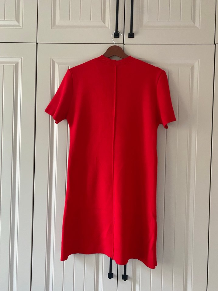 Kırmızı midi triko elbise, kısa kollu ve yüksek yakalıdır. Regular kesim ve pilili tasarıma sahiptir, yumuşak sentetik kumaştan üretilmiştir. Günlük kullanım için uygundur.