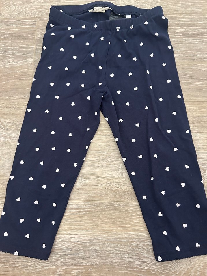 Kız çocukları için lacivert pamuklu tayt, elastik bel bandı ve küçük beyaz kalp desenleriyle sade bir tasarıma sahiptir. 7-8 yaş.Az kullanılmış defosuz