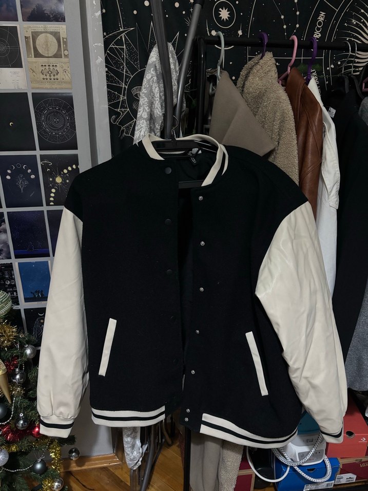 Kadın ceket, bol kesim, uzun kollu ve kesimli yakalıdır. Siyah gövde ve beyaz kollu, düğmeli kapamalı, yumuşak ve sıcak kumaştan yapılmıştır.