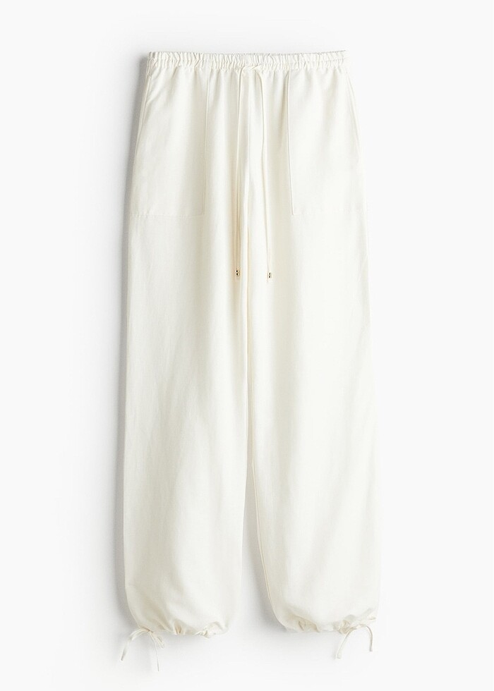 Keten karışımlı ince dokuma kumaş bol kesimli pantolon. Kaplı lastikli, uçlarında boncuk bulunan ince büzgü bağlı normal belli. Yama yan cepli, düz paçalı, paça ağızları büzgü bağlı. Beden: İç bacak: Uzunluk: 76.5 cm (Beden M) Bel Yüksekliği: Normal belli Kesİm: Bol kesim Viskoz 43%, Keten 30%, Pamuk 27% Birkaç kez giyildi vücut tipime uymadığı için satıyorum