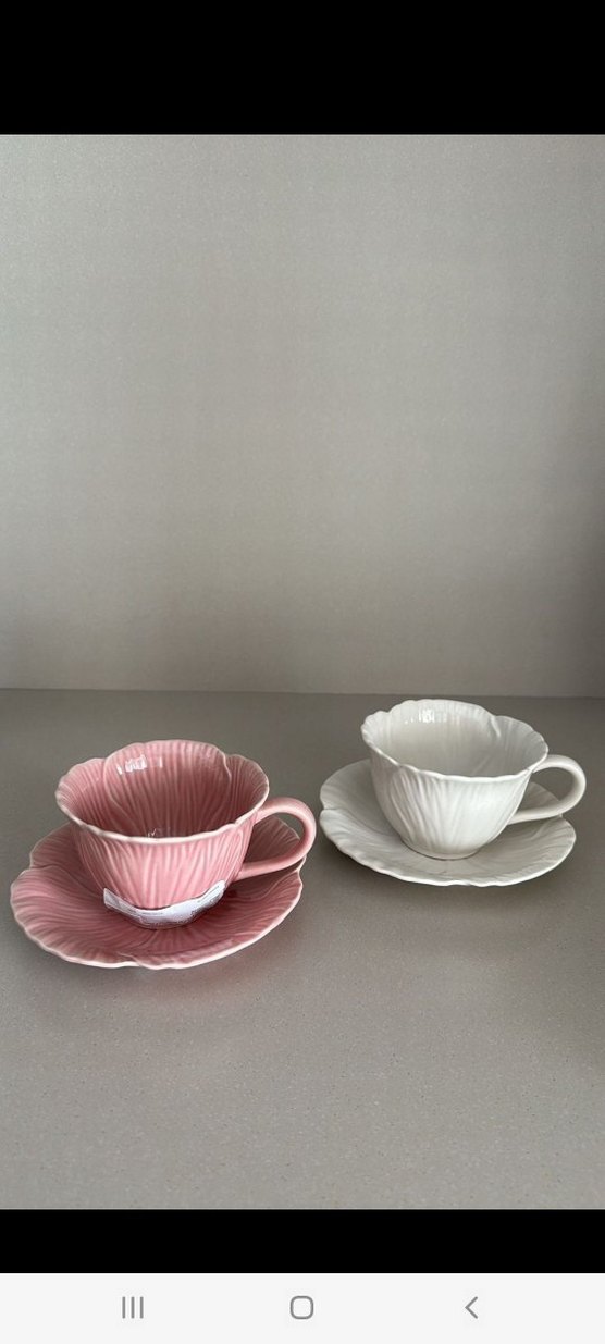 Pastel pembe ve beyaz renklerde, çiçek deseni ve yaprak şekilli kenarları olan fincan ve tabak takımı. ☕
