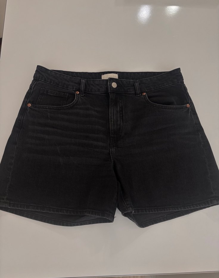 Siyah mini denim şortlar, rahat ve bol kesimiyle gündelik ve trend sokak stili için uygundur. Desensiz, şık ve rahat bir görünüme sahiptir. Etiketsiz fakat hiç giyilmedi