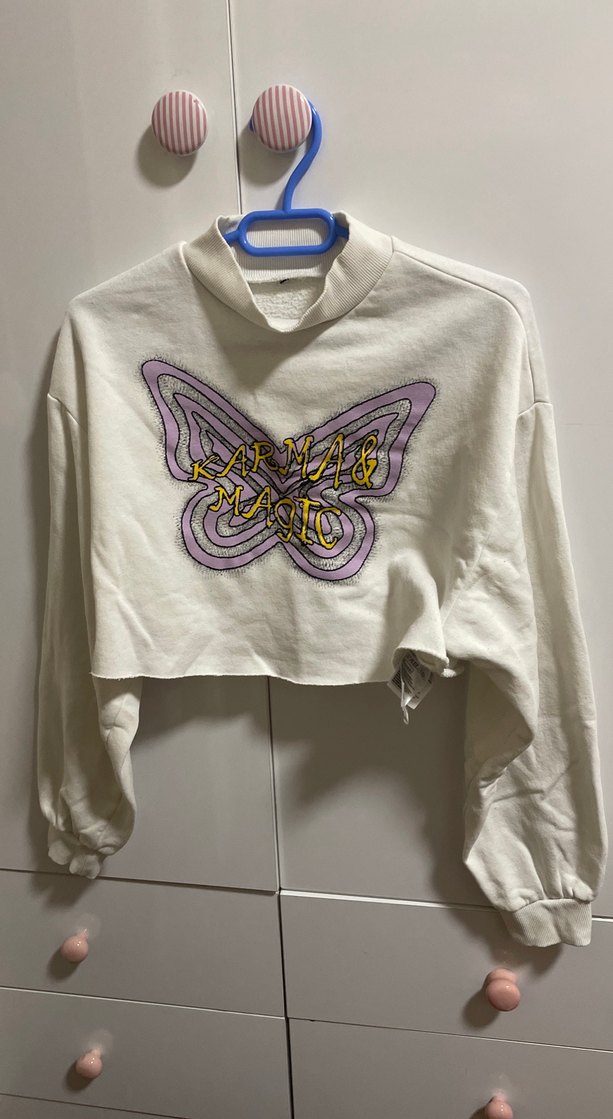 Beyaz, uzun kollu ve salaş kesim sweatshirt. Nakışlı kelebek baskısı ve 'Karma & Magic' detaylarıyla günlük kullanıma uygun.