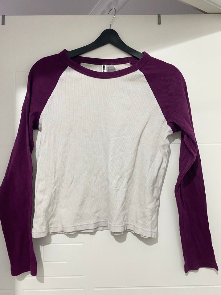 L beden uzun kollu, beyaz gövde ve mor kollara sahip, pamuklu ve rahat kesim tişört. Streetwear tarzında, bisiklet yaka tasarım.