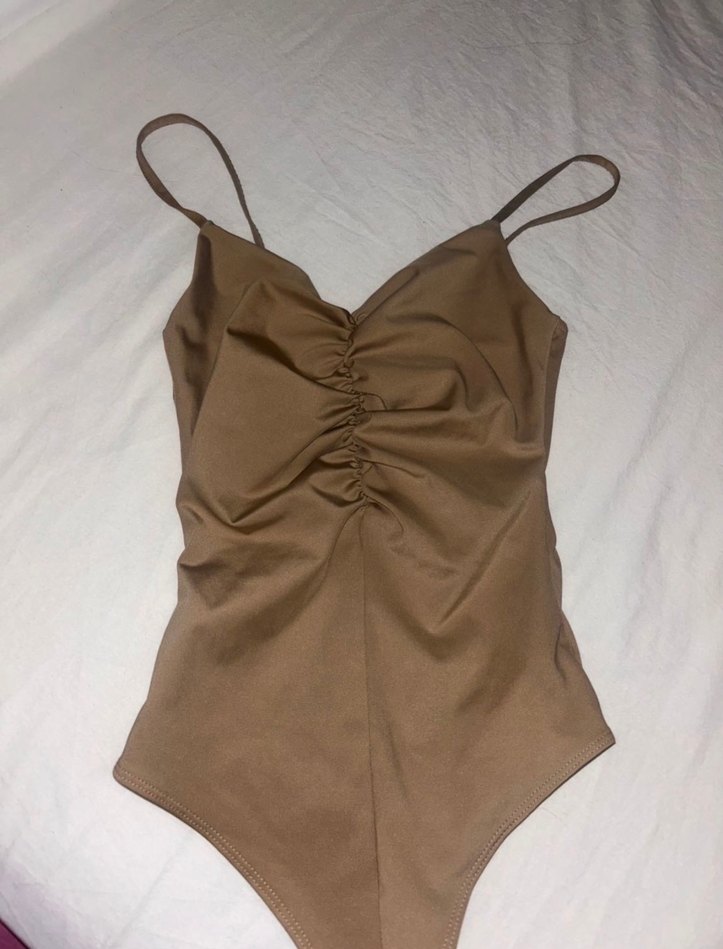 Bej renkli, ince askılı ve ön kısmı büzgülü kadın body, minimalist ve şık tasarımıyla günlük kullanıma uygundur.