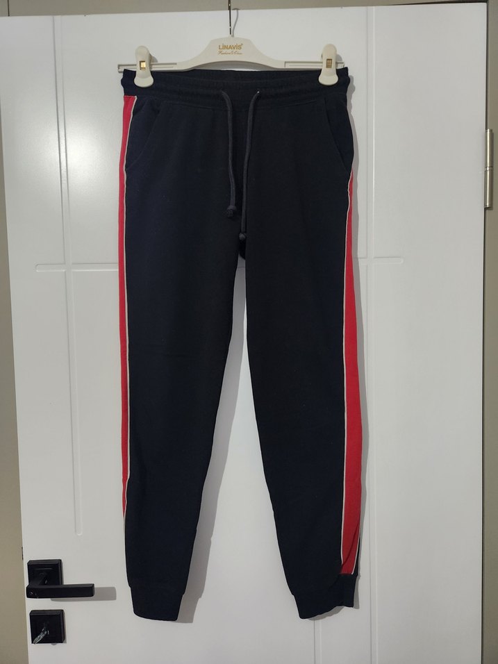 HM XS Beden Siyah Eşofman Altı. Kenarlarında kırmızı şeritler vardır. Paçaları lastiklidir. Beli bağlamalı olup kumaşı pamuklu yumuşacıktır. Cepleri vardır.