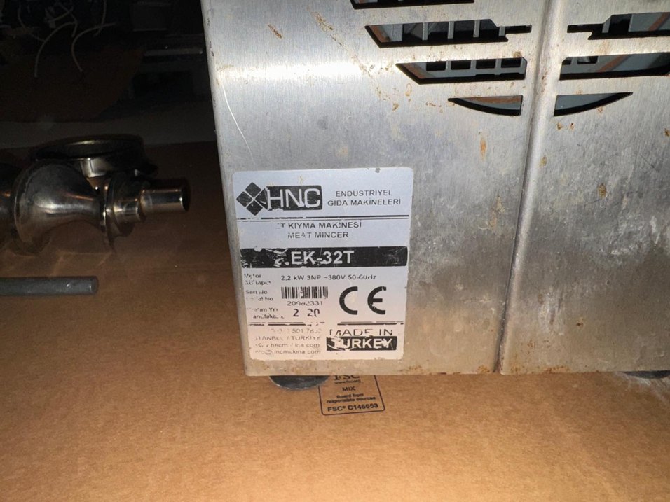 HNC EK-32T endüstriyel kıyma makinesi, 2.2 kW gücünde, 380V 50-60Hz motorlu, dayanıklı gri metal gövdelidir.