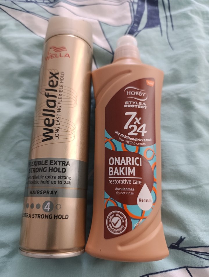 Hobby onarıcı bakım kremi keratin içerir, durulanmaz. Wella Wellaflex sprey ise 24 saate kadar ekstra güçlü esnek tutuş sağlar. ♀️