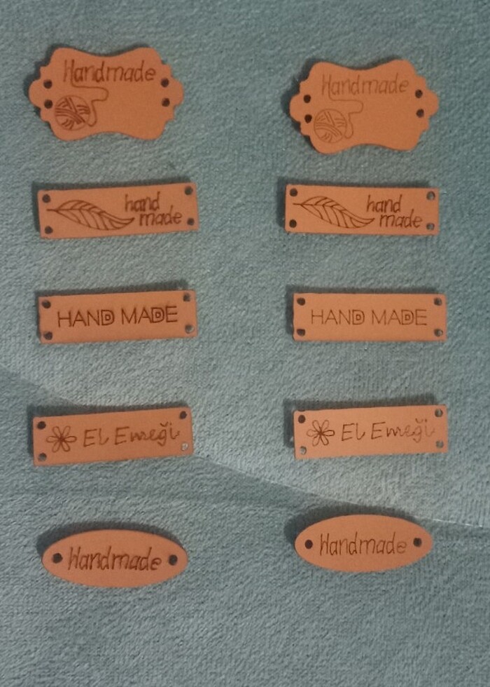 5 ADET FİYATIDIR Resimlerde göründüğü gibi Türkçe ve İngilizce deri üzerine el emeği hand made yazılı etiketler çanta örgü dikiş amigrumi gibi göz nuru işleriniz için
