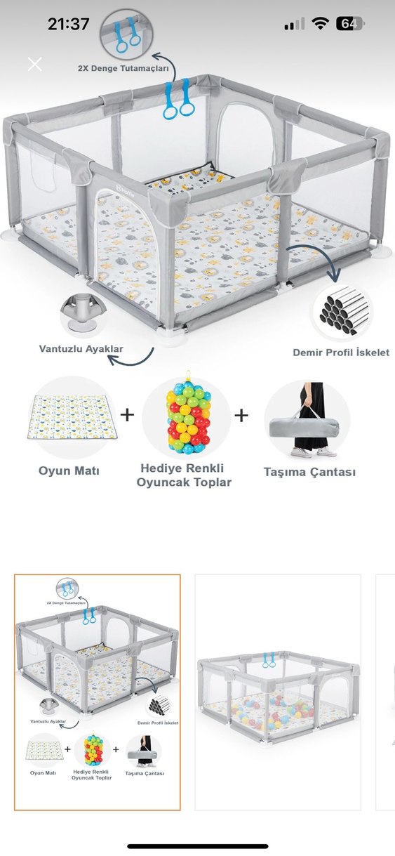 Neredeyse hiç kullanılmadı. Demir profil iskeletli gri oyun parkı, vantuzlu ayaklar, oyun matı, renkli oyuncak ve taşıma çantası içerir. Topları mevcut değildir