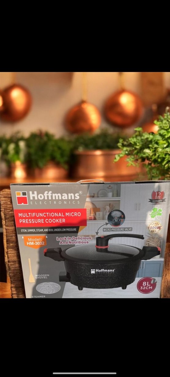 Hoffmans çok fonksiyonlu mikro basınçlı tencere, 8 litre hacim ve 32 cm çapıyla düşük basınçta pişirme sağlar. Ahşap oyuk ve mikro basınç valfi içerir. 12 yıl garanti.