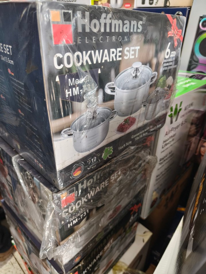Hoffmans 6 parçalı tencere seti, dayanıklı malzemeden üretilmiş beyaz ve gri tonlarda. Cam kapaklı ve ergonomik saplıdır.