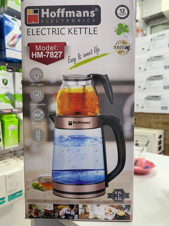 Hoffmans HM-7827 elektrikli çay makinesi LED ışıklı, 360° döner tabanlı ve 1500W gücündedir. 0.8L-2.2L cam hazne kapasitesi bulunur.
