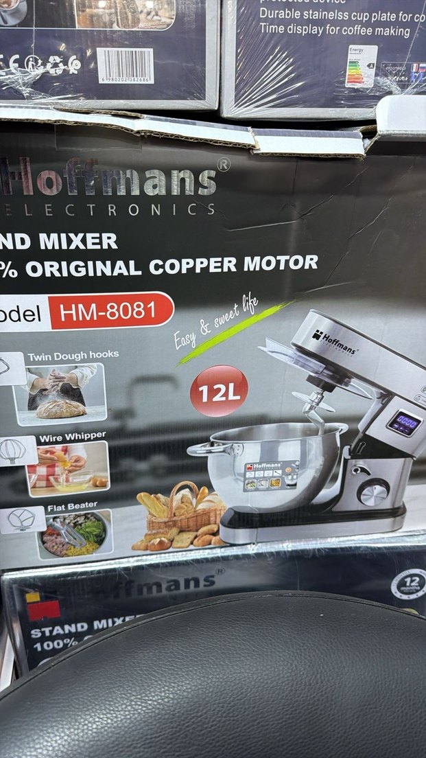 Hoffmans HM-8081 stand mikser, 12 litrelik kapasite ve %100 orijinal bakır motora sahiptir. İkili hamur kancaları, tel çırpıcı ve düz karıştırıcı içerir. Gri renktedir. Sifir ürün garantisi yok