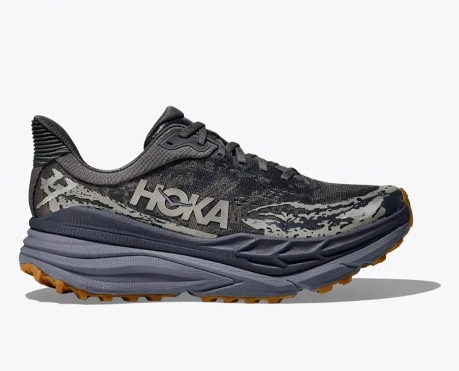 HOKA markalı gri erkek koşu ayakkabısı, baskılı desenli ve kauçuk tabanlıdır. Bağcıklı yapısıyla spor ve sokak stiline uygundur.