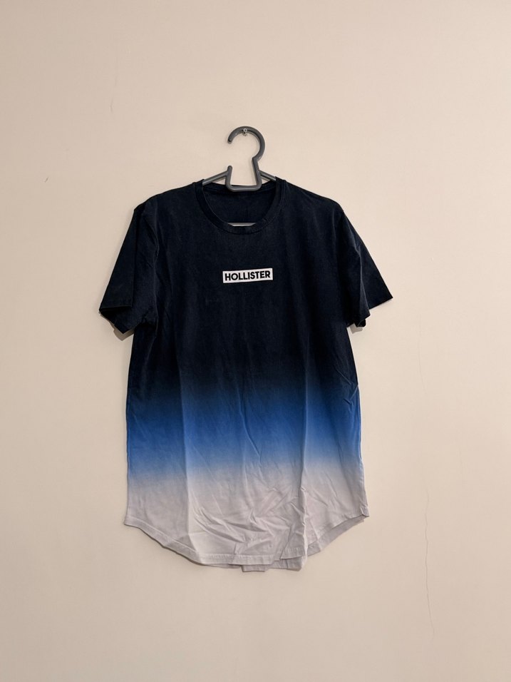 Hollister marka, koyu mavi ve beyaz batik desenli, kısa kollu ve bisiklet yakalı erkek tişörtü. Pamuklu, dü kesim ve rahat kullanımlık.