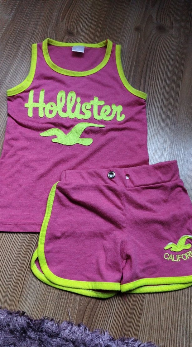 Hollister markalı, pembe neon yeşil detaylı, baskılı ve örgü kumaştan yapılmış, fitted kesim kız şort ve atlet takımı.