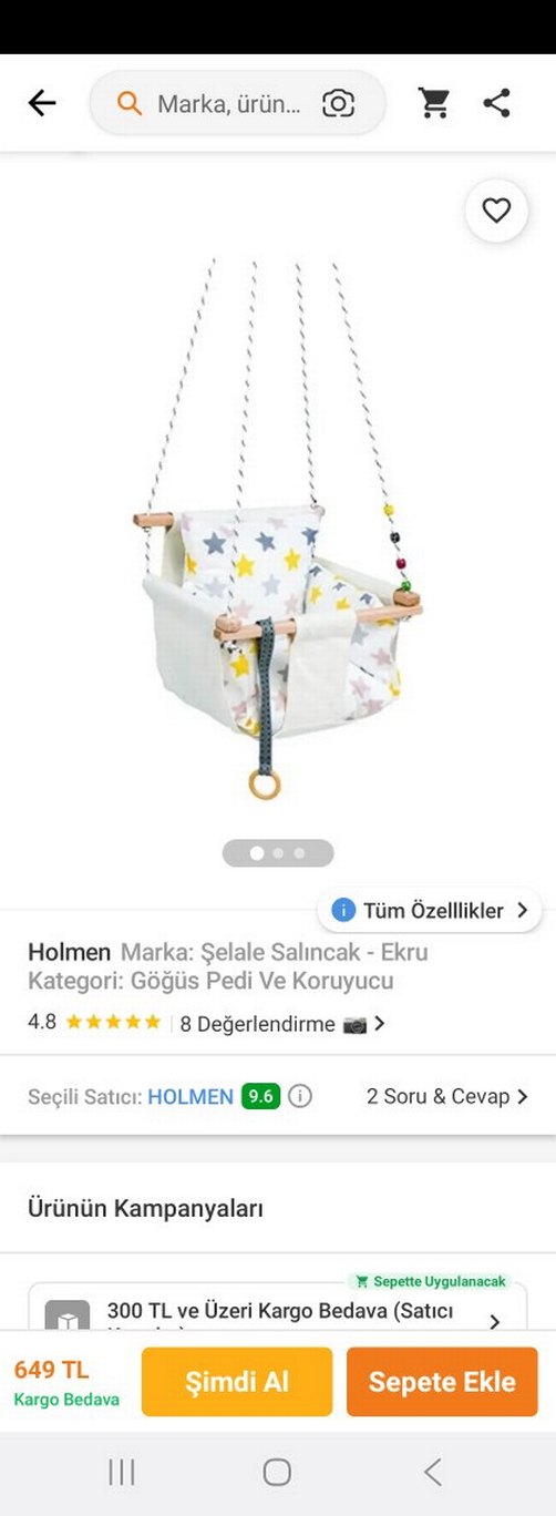 Holmen markasına ait ekru renkli, yıldız desenli minderli bebek salıncağı. Dayanıklı ip ve ahşap destek çubukları ile güvenli ve rahat kullanım sağlar. minderi yok bulursam eklerim, çok kullanamadık lekesi var yıkayacağım tavana monte edliyor