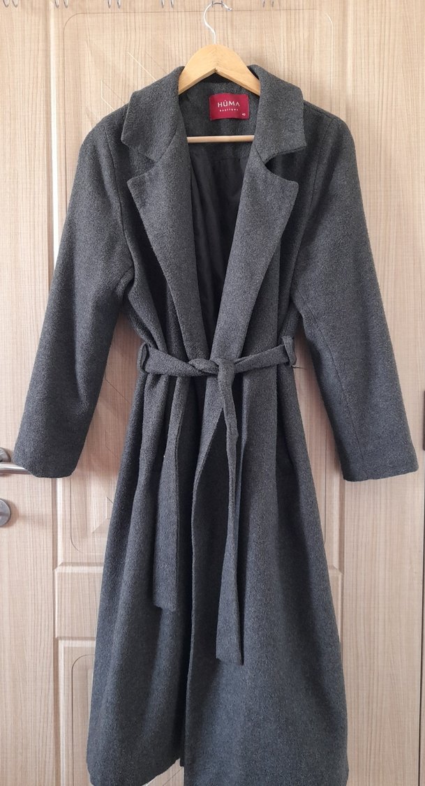 Homa markalı gri kaban, kuşaklı ve klasik yakalıdır. Sıcak tutan ve şık bir dış giyim seçeneğidir.