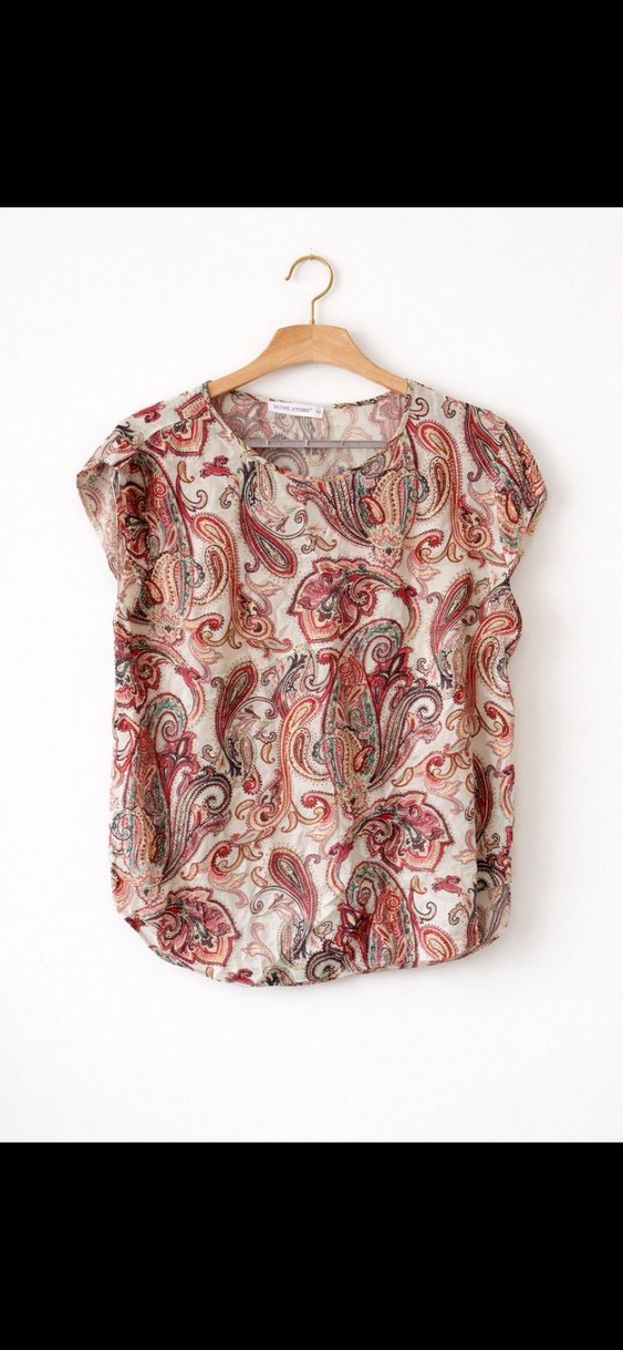 Home store 42 beden Renkli bohem desenli, kısa kollu, yuvarlak yakalı, bol kesim ve drapeli kadın bluz. Yumuşak sentetik kumaştan, paisley desenli.