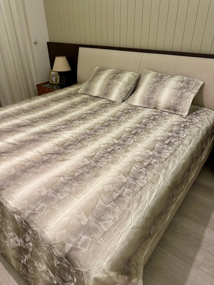 Bej ve gri renklerde, yumuşak dokulu hafif parlak yatak örtüsü. Üzerinde uyumlu yastık kılıfları bulunmaktadır. ️2 yastik kilifi ve bir 260x260 yatak ortusu. Yenidir.